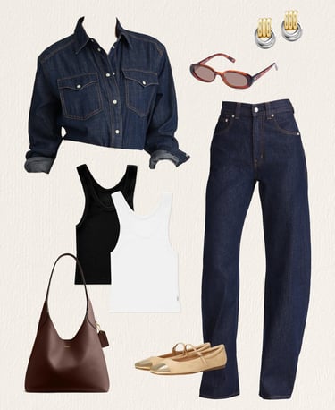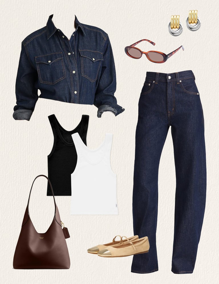 Here's some fashion inspiration for fall outfit ideas. Denim on Denim is easy to style with basic tanks and some ballet flats. Mixed metal huggies are practical for any day you can't decide whether to go with silver or gold. We also love separates that can easily be mixed and matched all winter long, like these jeans and denim shirt.
