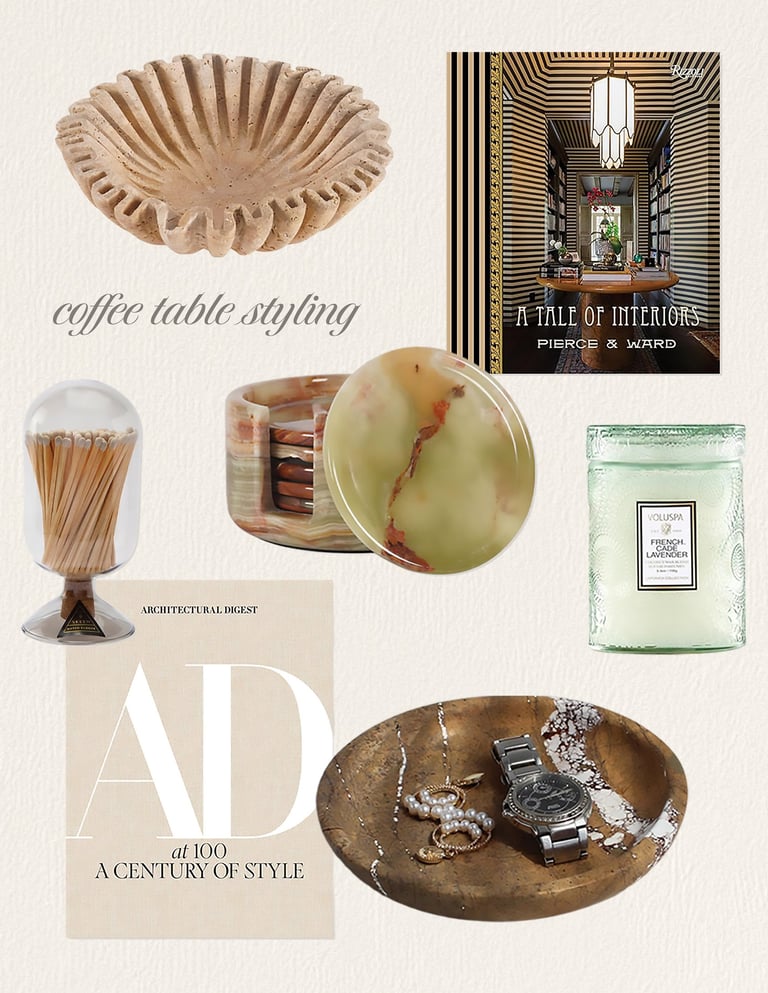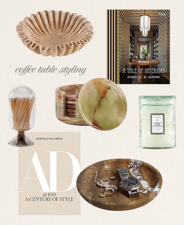 Stylize your coffee table with unique shapes, interesting reads, and purposeful finds. Make sure the items you choose are proportional to your table and feature a variety of different sizes. Mix and match neutrals with fun colors, play with textures, and switch out decor seasonally to keep it fresh and new.